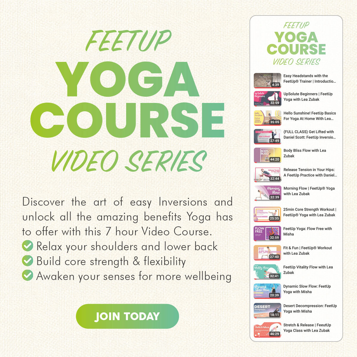 Guarantees a smooth start to your FeetUp Yoga Journey and makes sure your first steps with FeetUp are safe, enjoyable, and fun! 7h+ High Quality instruction from the world's most knowledgable teachers offer a wide variety of accessible classes for everyone and every body.